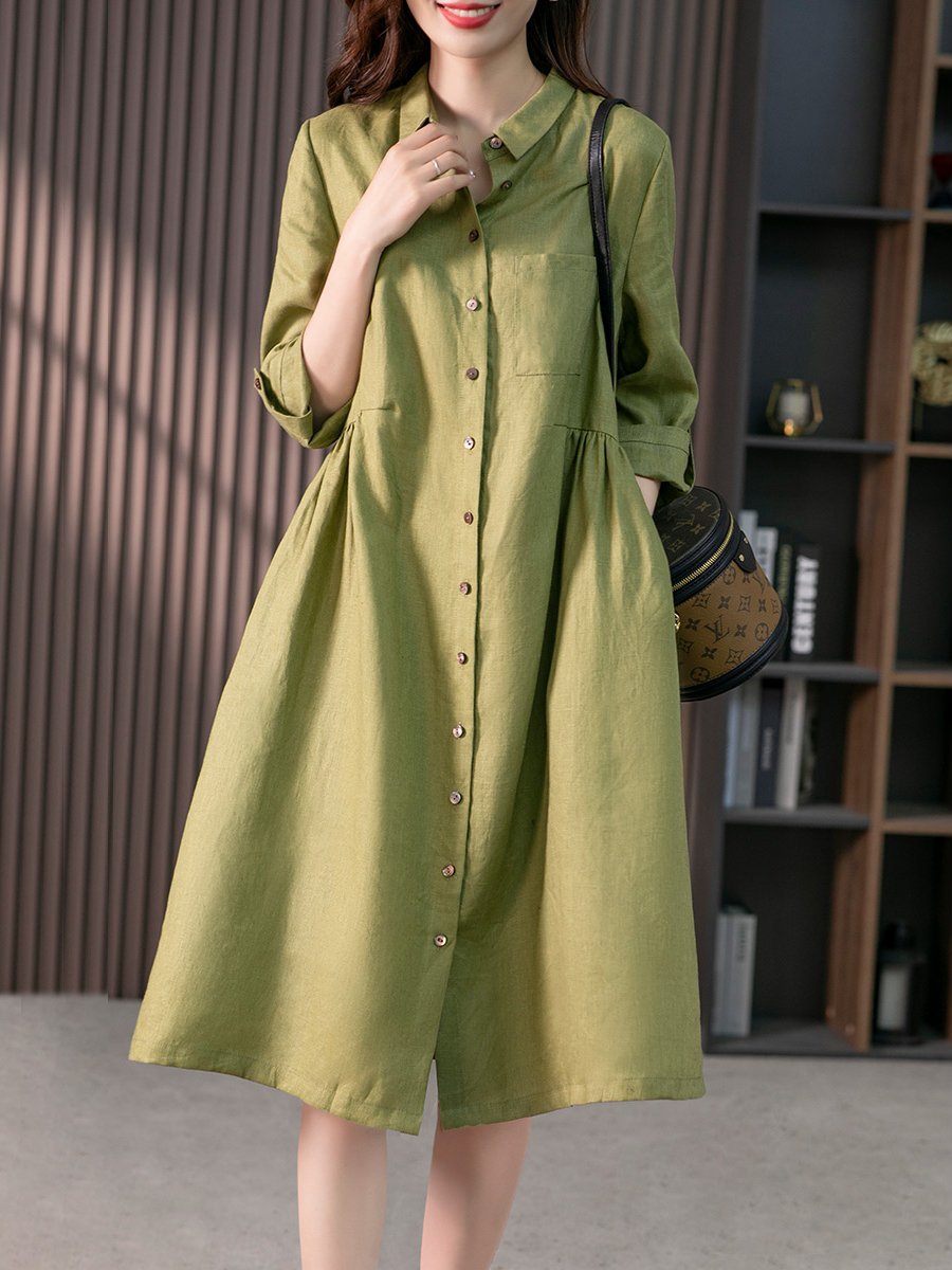 Age-defying slim linen solid color shirt dress
